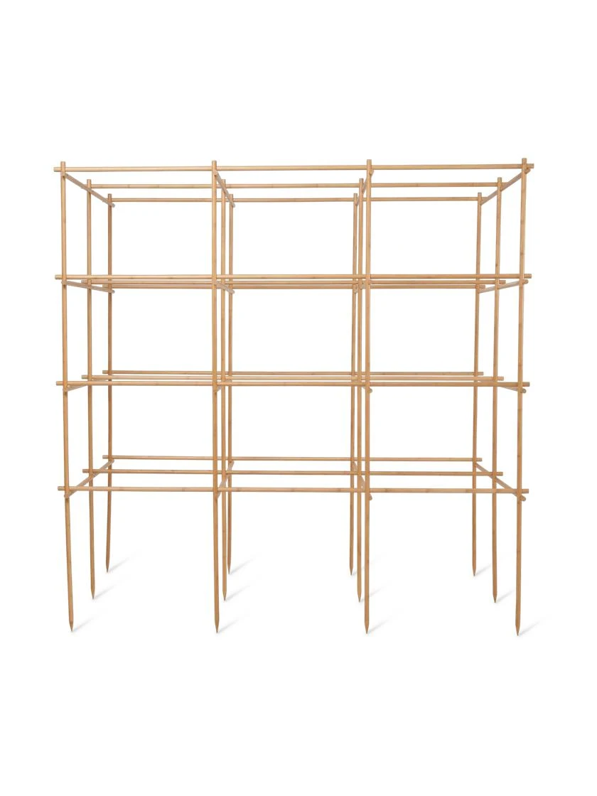 Sturdy, stylish, and sustainable, this massive bamboo structure has room for 6 full-size tomato plants, and provides helpful support and airflow while they grow. At over 6”, this structure is ideal for towering indeterminate tomatoes. It’s also perfect for peppers, eggplant, tomatillo, and any soaring or sprawling plants that benefit from several tiers of sturdy support. If planting seedlings, we recommend a 14”-16″ center support while young plants are getting established, and are not yet tall enough to reach the first level of the structure.